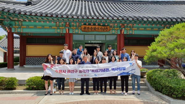 경기 수원시 권선구는 지난 12일 '호국보훈의 달'을 맞아 유관순열사기념관 및 천안 독립기념관으로 역사탐방을 다녀왔다. 이번 역사탐방은 3.1운동 및 대한민국임시정부수립 100주년을 기념해 권선구 공직자로서 올바른 국가관을 확립하고 순국선열 및 호국영령을 추모하고자 마련됐다. 사진은 참여자들이 기념촬영을 하는 모습.(사진제공=권선구청)