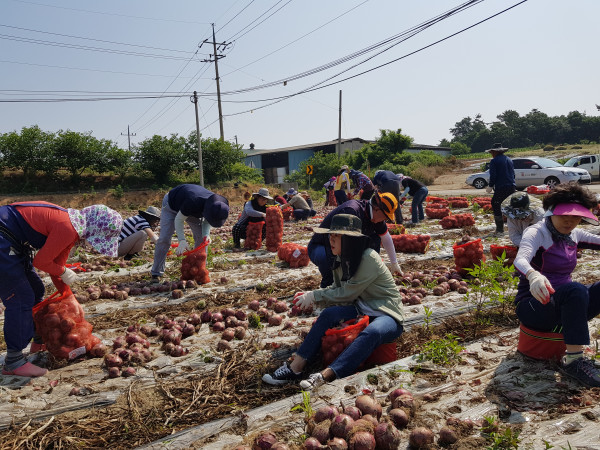 전남 영암군 서호면은 최근 영농철을 맞아 일손 부족으로 어려움을 겪고 있는 성재리 양파 농가를 찾아 일손을 도왔다. 이날 일손돕기에는 면사무소와 보건소 직원 및 기업도시지원사업소 직원 등 30여명이 참여했다. 사진은 양파를 수확하는 직원들의 모습. (사진제공=영암군청)