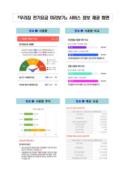 해당 서비스는 APT 개별세대 등 주택용 전력을 사용하는 모든 고객에게 제공되며, 간단한 접속과 수치 입력으로 이번 달 예상 사용량과 요금을 알려주고, 사용량 추이 및 과거 사용량과의 비교정보 제공을 통해 효율적인 전기사용이 가능하도록 개발됐다.