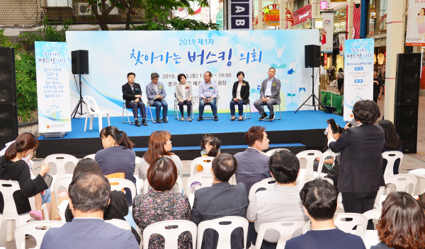 울산시의회는 중구 성남동 메가박스 앞 광장에서 2019년 제1차 찾아가는 버스킹 의회를 열었다. 사진은 시민들의 의견을 모아 '더욱더 살기 좋은 울산을 만들어 가겠다'는 의미로 황세영 시의장을 비롯한 의원들이 시민들과 함께 소통하는 모습. (사진제공=울산시의회)