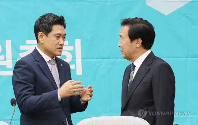바른미래당 손학규 대표와 오신환 원내대표가 17일 국회에서 열린 의원총회에서 이야기하고 있다.