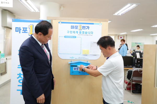 | ▲ 유동균 구청장(왼쪽)이 동주민센터에 방문한 가운데 구민이 마포1번가 파란우체통에 의견서를 제출하고 있다. (사진제공=마포구청) | ||