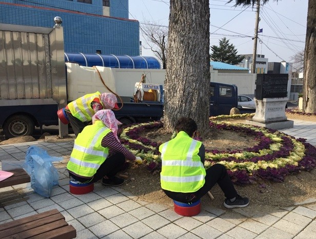 | ▲ ※사진설명: 창녕읍사무소에서 일하고집이 참여자들이 마을경관조성을 하고 있다. | ||