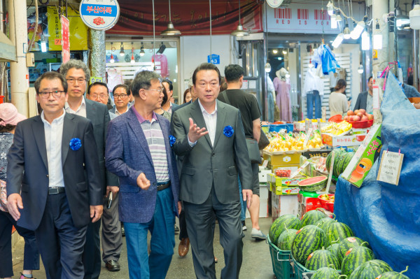 노현송 강서구청장이 17일 화곡본동시장에서 열린 문화관광형시장 육성사업 착수보고회에 참석했다. 이날 사업 설명회, 지역공동체 상생협력 협약식 등이 진행됐다. 사진은 노 구청장(오른쪽)이 관계자들과 시장 곳곳을 살피는 모습. (사진제공=강서구청)