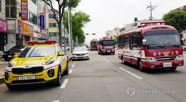18일 오후 경기 광주 북구 일대에서 광주 북부소방서가 '소방차 길 터주기 훈련'을 하고 있다. 북부소방서는 말바우 시장~전남대 후문~북부소방서 등을 거치는 구간에서 소방차의 재난현장 접근성을 높이기 위해 긴급 출동 훈련을 했다.