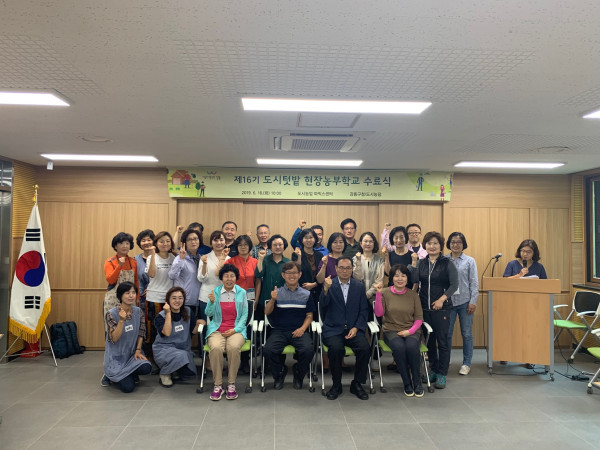 서울 강동구는 18일 명일근린공원내 도시농업파믹스센터에서 주민 누구나 쉽게 농사를 지을 수 있도록 이론 및 실습교육을 병행하는 프로그램인 ‘2019년 상반기 현장농부학교’ 수료식을 개최했다. 사진은 수료식 후 기념촬영을 하는 모습. (사진제공=강동구청)