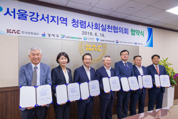 강서구가 19일 한국공항공사 대회의실에서 한국공항공사, 한국청렴운동본부, 강서양천교육지원청 등 6개 기관과 ‘청렴사회실천 협약’을 체결했다. 사진은 노현송 구청장(왼쪽 세 번째)과 기관 관계자들이 기념촬영을 하는 모습. (사진제공=강서구청)