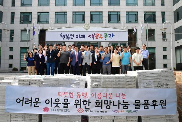 서울 중랑구는 지난 20일 구청 중앙광장에서 '(사)희망을나누는사람들'로부터 지역의 어려운 이웃에게 써달라며 샴푸, 선스틱, 햄세트 등 1억원 상당의 성품을 전달받았다. LG생활건강이 후원하고 (사)희망을나누는사람들이 전달한 후원물품은 지역내 복지시설 및 기관 등에 배분해 지역 저소득층 가구에 고루 나눠질 수 있도록 할 계획이다. 사진은 이수연 부구청장이 김정안 대표 및 관계자들과 기념촬영을 하는 모습.(사진제공=중랑구청)