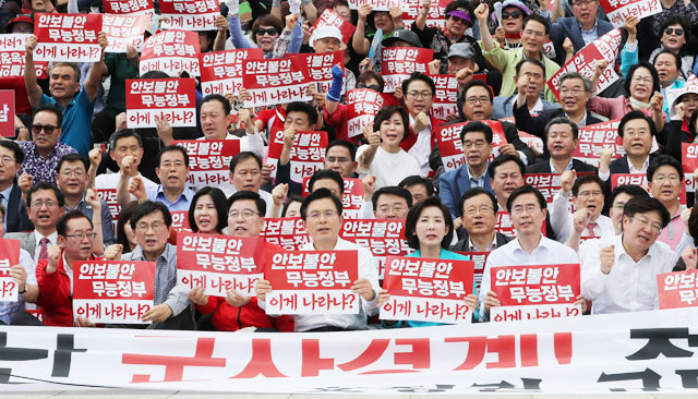 자유한국당 황교안 대표, 나경원 원내대표와 의원, 당원들이 23일 오후 국회 본관 앞 계단에서 열린 ‘구멍난 군사경계! 청와대 은폐조작! 문정권 규탄대회’에서 구호를 외치고 있다. /연합뉴스