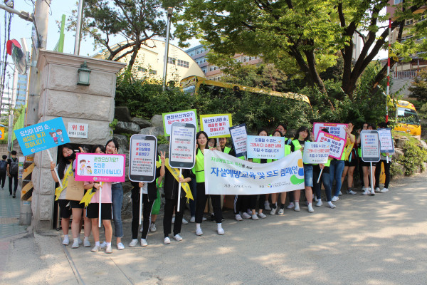 서울 은평구 응앙보건지소가 최근 갈현동과 연신내역 주변에서 은평종합사회복지관 및 선일여자고등학교 학생 25명과 청소년 자살예방을 위한 '보고듣고말하기 교육 및 자살예방로드 캠페인'을 펼쳤다. 사진은 홍보 피켓을 든 학생들이 캠페인에 참여하는 모습. (사진제공=은평구청)