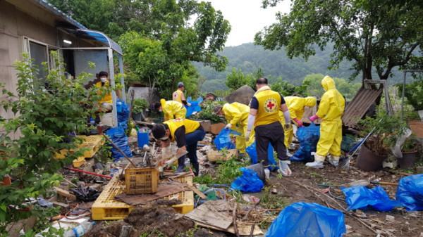 경기 연천군 전곡읍 지역사회보장협의체는 적십자어울림봉사회와 연천사랑 가족봉사단과 연계해 최근 지역내 저소득 가구를 방문, 대상가정의 쾌적한 주거환경 조성을 위한 '주거환경 개선 사업'을 실시했다. 사진은 환경 개선 작업을 펼치는 모습. (사진제공=연천군청)