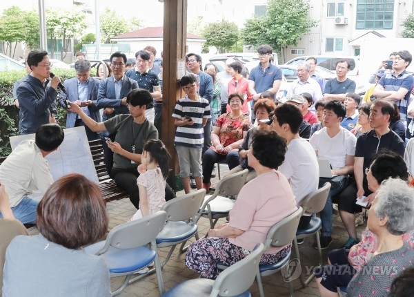 채현일 영등포구청장이 23일 영등포구의 한 아파트에서 열린 '붉은 수돗물 주민설명회'에 참석해 발언을 하고 있다.