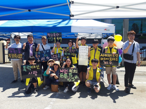 경기 남양주시 금곡동 청소년자치위원회는 최근 남양주 아트센터에서 개최된 남양주점프벼룩시장 행사에 참여해 학교폭력 근절 캠페인을 실시했다. 이날 왕따 등 글씨를 새겨넣은 풍선을 터뜨리는 행사 등이 진행됐다. 사진은 기념촬영을 하는 모습. (사진제공=남양주시청)
