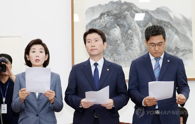 24일 서울 여의도 국회에서 여야 3당 원내대표가 6월 임시국회 개최 관련 여야3당 합의문을 발표하고 있다. 왼쪽부터 자유한국당 나경원, 더불어민주당 이인영, 바른미래당 오신환 원내대표.