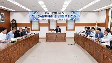 이날 간담회는 울산 건축분야 애로사항 청취를 위해 마련되었으며, 건축물의 현장조사․검사 및 확인업무 대행 수수료 인상을 위한 건축조례 개정사항과 울산건축문화제의 지속적 추진을 위한 예산 증액 방안 등을 논의하고자 참석자들의 다양한 의견을 수렴하는 방식으로 진행되었다.