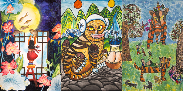 | ▲ 그림 좌측부터, 중등부 대상 김윤주(경기 화성 안화중2년)의 '소녀의 소원' 작품, 초등 고학년부 대상 설희연(경기 성남 복정초4년)의, '노천탕을 즐기는 호랑이' 작품, 초등저학년부 한시현(서울세륜초2년)의 '호랑이 친구들' 작품 | ||