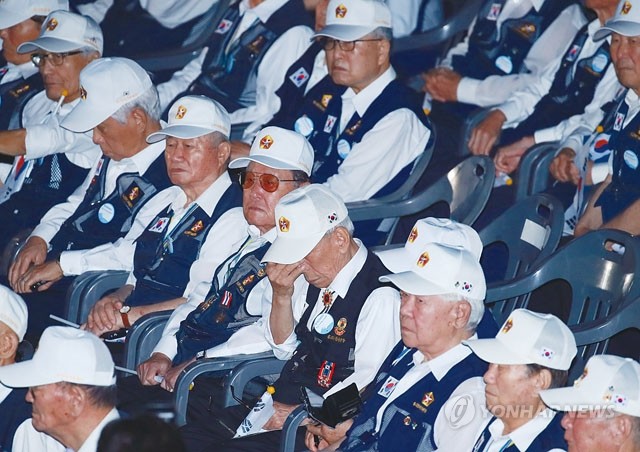 25일 서울 중구 장충체육관에서 열린 6.25 전쟁 69주년 기념 행사에서 한 6.25 참전 유공자가 동영상을 시청하던 중 눈물을 닦고 있다.