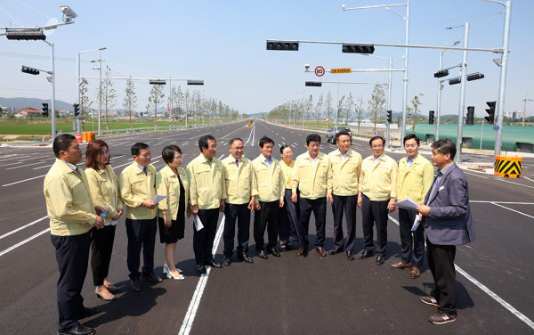 충남 서산시의회는 25일 동서간선도로 잠홍~석림 구간 개설 공사 현장을 방문해 그동안의 추진상황을 보고 받고 현장을 둘러봤다. 사진은 임재관 의장(왼쪽 다섯 번째)과 의원들이 현장 관계자로부터 주요 추진상황에 대해 보고 받는 모습. (사진제공=서산시의회)