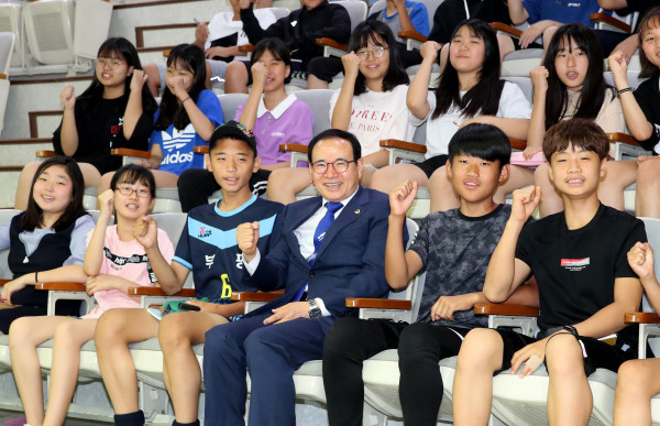 | ▲ 최근 의정아카데미 본회의 체험교실에 참여한 인천부평초 학생들이 시의회를 방문한 가운데 이용범 의장이 학생들과 함께 기념촬영을 하고 있다. (사진제공=인천시의회) | ||