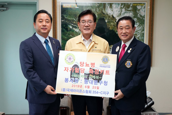 서울 동대문구는 25일 국제라이온스 협회 354-C지구로부터 저소득층 당뇨환자를 위한 혈당측정기 및 시트지를 기증받았다. 사진은 이날 전달식에서 유덕열 구청장(가운데)와 국제라이온스협회 관계자들이 기념촬영을 하는 모습. (사진제공=동대문구청)