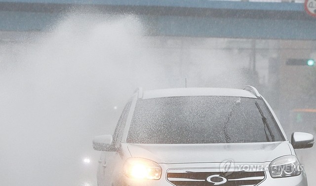 올해 장마가 시작된 26일 오전 경남 창원시 마산합포구 해안도로를 달리는 승용차가 물보라를 일으키고 있다.