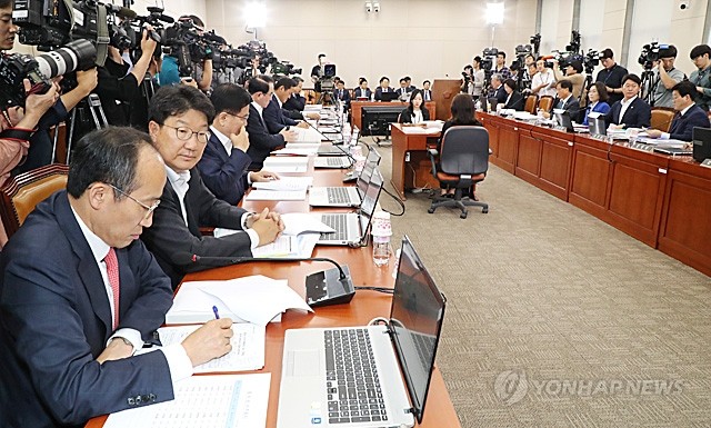 자유한국당 추경호(왼쪽부터)·권성동 의원 등이 26일 오전 국회에서 열린 김현준 국세청장 후보자 인사청문회에 참석해 자리하고 있다.
