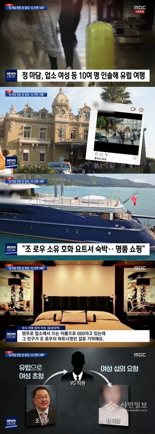 24일 MBC '뉴스데스크'는 정 마담 원정 성접대와 관련해 YG엔터테인먼트 연루 의혹을 보도했다. '뉴스데스크에 따르면 강남 유흥업소의 일명 정 마담이 업소 여성들을 이끌고 유럽으로 '원정 접대'를 다녀온 것은 YG 엔터테인먼트 직원이 기획했다.