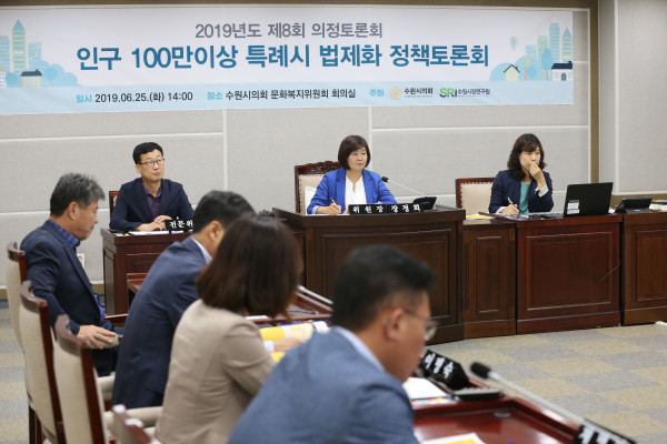 | ▲ ‘수원시 특례시 추진 특별위원회’ 위원들이 회의하고 있다. (사진제공=수원시의회) | ||