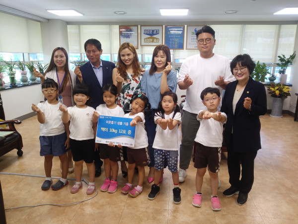 경기 양주시 만송동에 위치한 '황토어린이집'은 최근 양주2동 행정복지센터에 방문해 지역내 홀몸노인에게 전달해 달라며 백미 10kg, 12포를 기탁했다. 사진은 이날 전달식에서 어린이집 교사들과 원아들이 백미 전달 후 기념촬영을 하는 모습. (사진제공=양주시청)