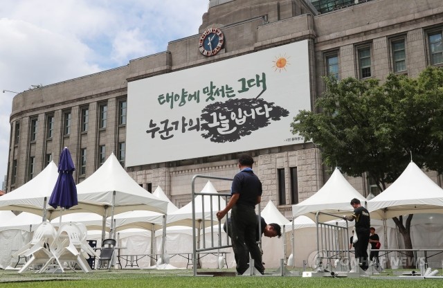27일 오후 서울도서관 외벽에 서울꿈새김판 여름편 문안 공모전 당선작인 윤하은 씨의 ‘태양에 맞서는 그대, 누군가의 그늘입니다’가 내걸려 있다. 태양에 ‘맞선다’는 표현으로 무더운 여름을 이겨내고자 하는 당당함과 열정이 느껴진다고 문안선정위원회는 밝혔다.