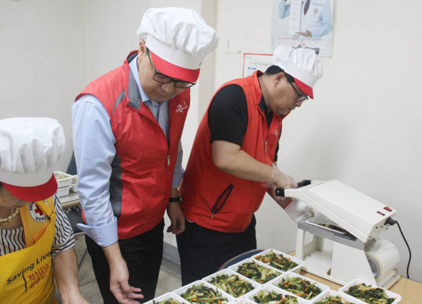 한국마사회 서울 강동지사가 최근 대한적십자사 강동지구협의회가 주관하는 지역내 저소득 취약계층 밑반찬 지원 봉사활동에 참여했다. 이날 마사회는 밑반찬을 만들기 위해 500만원을 후원하고 임직원들이 직접 봉사활동에 참여했다. 사진은 밑반찬을 포장하는 임직원들의 모습. (사진제공=대한적십자사 강동지구협의회)