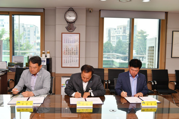 경기 양평군은 28일 군수 집무실에서 정동균 군수, 한현수 양평농업협동조합장, 강성욱 용문농업협동조합장 등이 참석한 가운데 지역내 경로당에 '양평 쌀 공급을 위한 협약식'을 개최했다. 사진은 정 군수(가운데)와 관계자들이 협약서에 서명하는 모습. (사진제공=양평군청)