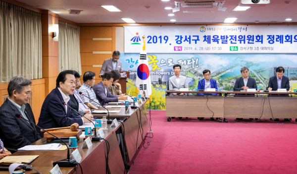 서울 강서구는 최근 구청 대회의실에서 임원 등 30여명이 참석한 가운데 ‘체육발전위원회 정기회의’를 개최했다. 이날 회의는 상반기 체육회 활동 사항 검토 등의 순으로 진행됐다. 사진은 노현송 구청장(왼쪽에서 두 번째)이 인사말을 전하는 모습. (사진제공=강서구청)