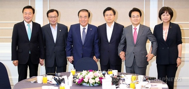 문희상 국회의장(왼쪽 세번째)이 1일 여의도 국회 본관에서 열린 초월회 오찬 간담회에서 각 당 대표들과 기념촬영을 하고 있다. 왼쪽부터 바른미래당 손학규 대표, 더불어민주당 이해찬 대표, 문 의장, 자유한국당 황교안 대표, 민주평화당 정동영 대표, 정의당 이정미 대표.