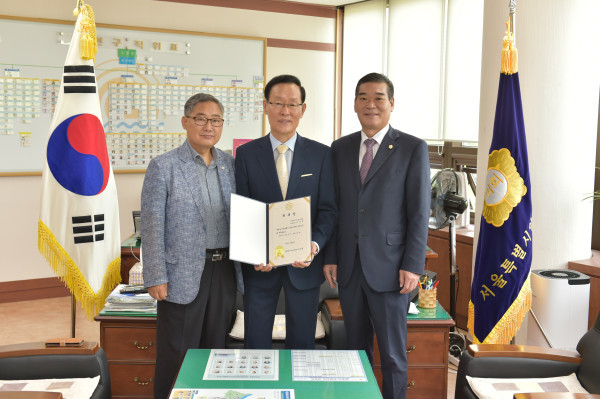 | ▲ 서우선 양천구의회 입법고문(가운데)이 재위촉 후 신상균 의장(오른쪽)과 기념촬영을 하고 있다. (사진제공=양천구의회) | ||