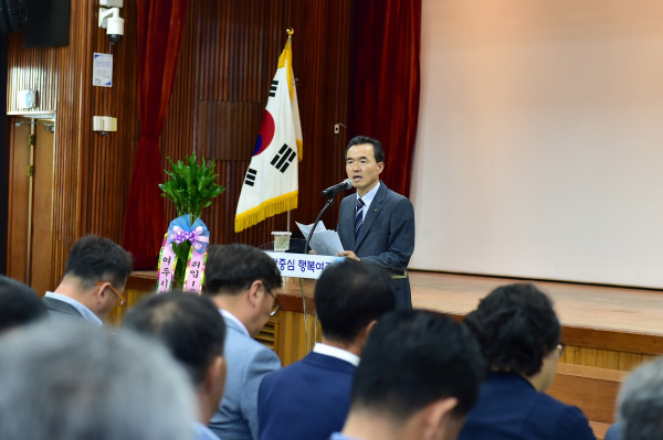 경기 여주시는 1일 민선7기 이항진 시장 취임 1주년을 기념해 시청 대회의실에서 월례조회를 개최했다. 이날 자랑스러운 공무원, 방범활동 유공자 등에 대한 시상도 이뤄졌다. 사진은 이날 조회에서 이 시장이 인사말을 전하고 있는 모습. (사진제공=여주시청)
