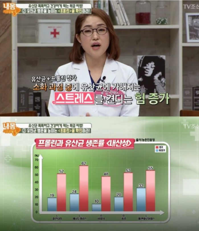 프롤린유산균은 TV CHOSUN 교양 프로그램 '내 몸 사용설명서'에 소개되기도 했다. 심선아 영양학박사는 "유산균에 프롤린을 첨가하면 유산균이 소화관을 통과하는 동안 받는 여러 스트레스를 견디는 힘이 크게 증가하는 것으로 나타났다"며 "내산성과 내담즙성이 프롤린을 첨가한 유산균에서 더 높았다"고 전했다.