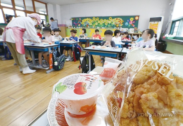 학교 비정규직 노동자들이 총파업에 들어간 3일 오후 서울의 한 초등학교에서 어린이들이 대체 급식으로 제공된 빵과 에너지바 등으로 점심식사를 하고 있다.