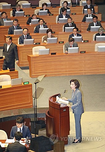 자유한국당 나경원 원내대표가 4일 오전 열린 국회 본회의에서 교섭단체 대표연설을 하고 있다.