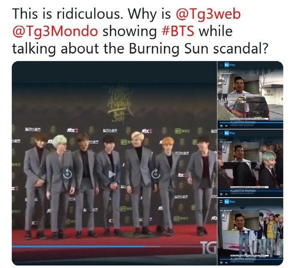 한 이탈리아의 방탄소년단 팬은 SNS에 “정말 웃긴다. 왜 ‘TG3 Mondo’는 버닝썬 사건을 얘기하면서 BTS를 보여주고 있지?”라며 해당 방송 화면을 캡처해 게재했다.