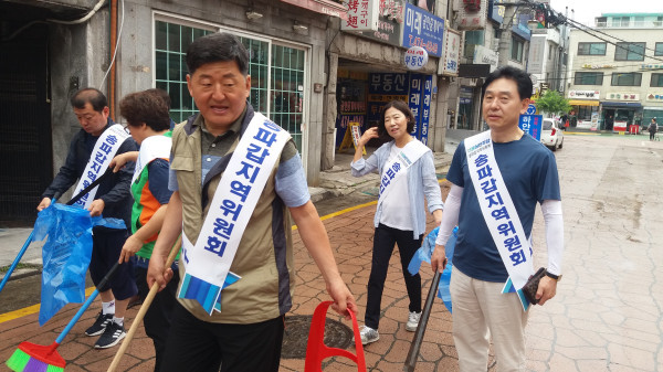 최근 더불어민주당 송파갑지역위원회가 민·관합동으로 ‘미세먼지 OUT’이란 슬로건을 내걸고 풍납동 일대 거리 대청소를 실시했다. 사진은 청소를 하고 있는 참가자들의 모습. (사진제공=송파구의회)