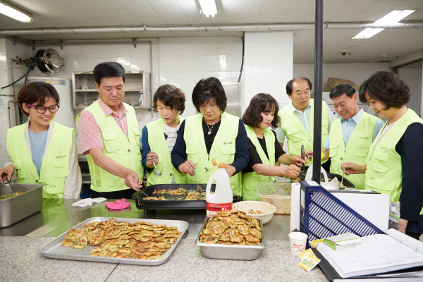 | ▲ 배식 봉사활동에 참여한 의원들이 전을 부치고 있다. (사진제공=용인시의회) | ||