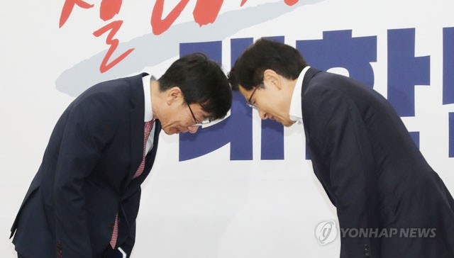 자유한국당 황교안 대표(오른쪽)가 5일 오후 국회 당 회의실에서 김상조 청와대 정책실장의 예방을 받고 인사하고 있다.