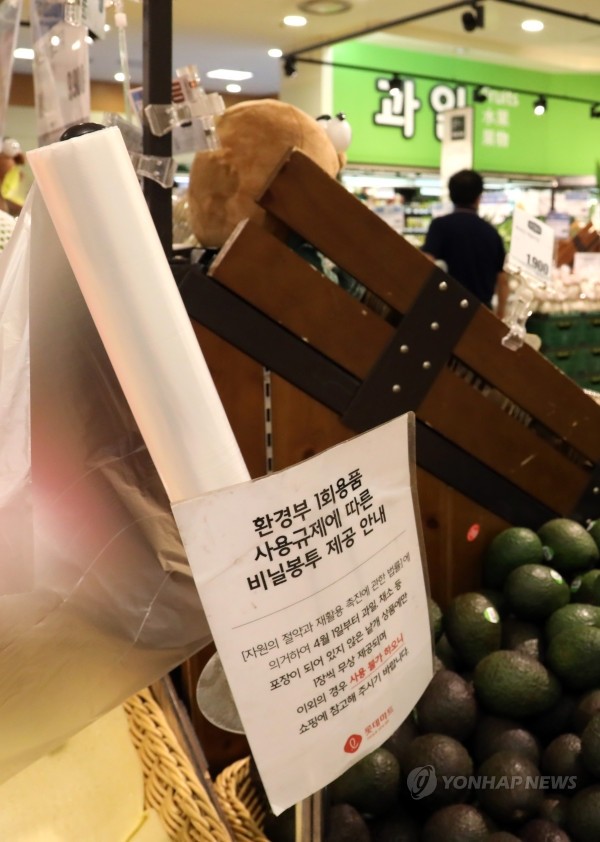 1회용 비닐봉지 사용 제한이 시행된 지 석 달여가 지난 8일 오전 서울 롯데마트 서울역점에 환경부의 비닐봉지 사용 규제에 따른 비닐봉지 제공 안내문이 붙여져 있다.