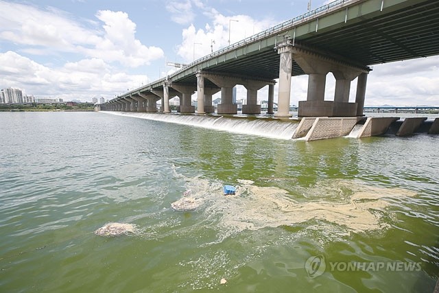 8일 오후 서울 송파구 잠실대교 남단 수중보 주변 한강 물빛이 탁해진 모습을 보이고 있다. 환경부는 인천 서구 등지에 물을 공급하는 서울 풍납취수장 일대 한강에서 발생한 녹조가 비린내의 원인인 것으로 추정하고 있다.