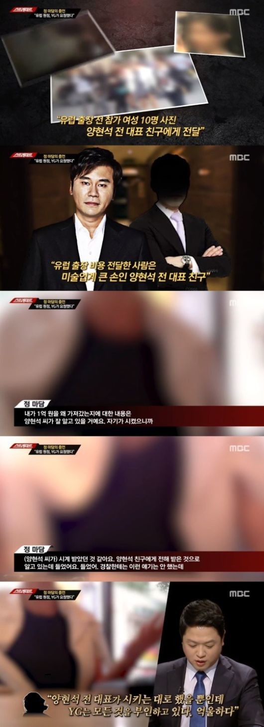 정 마담은 이어 출장 준비 과정에서 "10명의 여성 사진을 보내줬고 양현석의 친구에게 보내주면 그쪽으로 전한 것으로 알고 있다"며 출장 일주일 전에는 자신에게 2억원 상당의 유로가 전달됐다고 말했다.