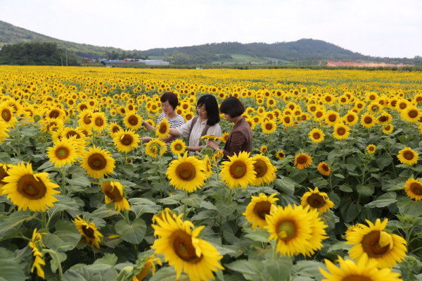 전남 해남군 마산면 노하리에 위치한 해바라기 농장에 해바라기가 만개해 관광객들의 발길을 이끌고 있다. 8일 오후 해바라기 농장을 방문한 관광객들은 노란 물결을 연신 카메라에 담았다. 사진은 관광객들이 해바라기를 구경하는 모습. (사진제공=해남군청)