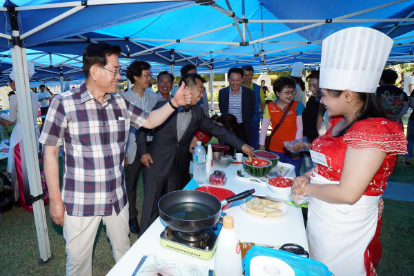 유덕열 동대문구청장이 최근 용신동 용두공원에서 열린 ‘제4회 다문화 요리 페스티벌’에 참석했다. 이날 행사는 다문화 가정에 대한 이해의 폭을 넓히고 상호 교류를 활성화하기 위해 마련됐다. 사진은 유 구청장(왼쪽)이 인사를 건네는 모습. (사진제공=동대문구청)