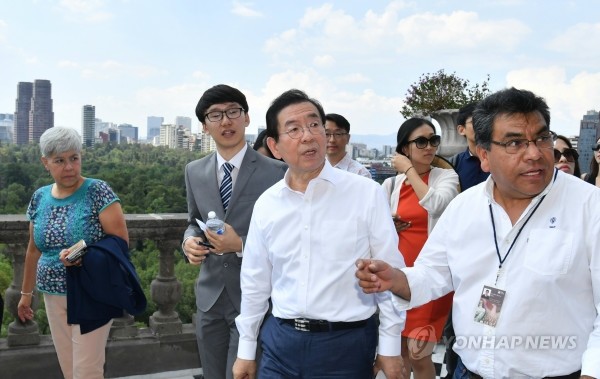 중남미를 순방 중인 박원순 시장이 9일(현지시간) 중남미에서 두 번째로 큰 멕시코의 도시공원 '차풀테펙 도시공원(Bosque de Chapultepec)'을 방문해 설명을 듣고 있다.