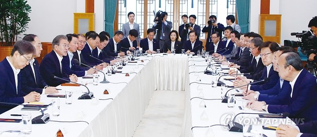 문재인 대통령이 10일 오전 청와대에서 30대 기업을 만나 일본의 수출규제 조치와 관련한 대책을 논의하기에 앞서 인사말을 하고 있다. 이날 간담회에는 삼성·현대차·SK·LG·롯데 등 5대 그룹을 포함해 총자산 10조 원 이상 대기업 30개사와 경제단체 4곳이 참석했다.